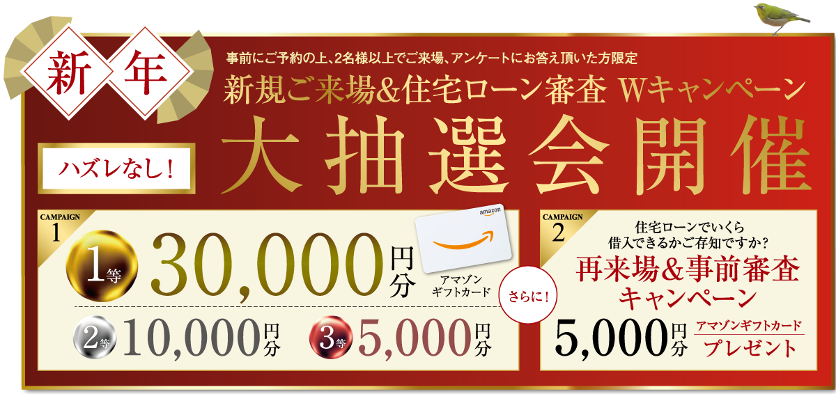 ※キャンペーン主催:株式会社ブリス。AmazonはAmazon.com, Inc.またはその関連会社の商標です。本キャンペーンについてのお問い合わせはAmazonではお受けしておりません。株式会社ブリスまでお願いいたします。※新規来場キャンペーン:事前にご予約のうえ本物件に初めてご来場いただき、アンケートにもれなくお答えいただいた方に限ります。数に限りがございます。無くなり次第終了とさせていただきます。成人2名以上1世帯1回限りとさせていただきます。写真・イラストはイメージです。※再来場&事前審査キャンペーン:本プレゼントは住宅ローンの事前審査申込をされた方のみ対象とさせていただきます。事前審査の申込には、ご本人様の確認書類や収入の分かる書類、お認印等が必要になります。本キャンペーンのご参加は、1家族様1回限りとさせて頂きます。